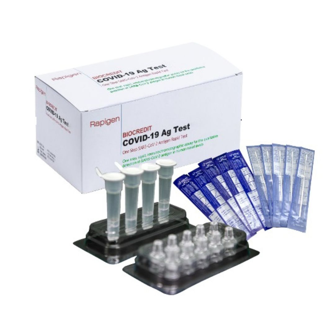 Bộ Kit Test Nhanh Rapigen BIOCREDIT COVID-19 Ag Hàn Quốc giúp phát hiện kháng nguyên SARS-CoV-2 trong mẫu ngoáy dịch tỵ hầu của người. Bộ Kit Test này đạt chứng nhận KFDA Hàn Quốc (Cục quản lý an toàn thực phẩm và dược phẩm Hàn Quốc) và được Tổ chức Y tế Thế giới (WHO) khuyến nghị sử dụng và được sử dụng nhiều trên hơn 50 quốc gia trên thế giới.